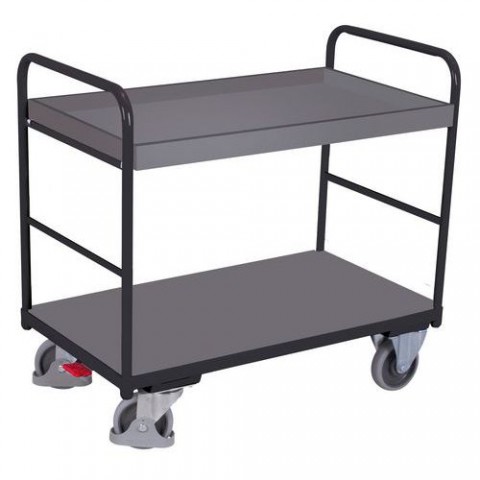 Kovové vozíky se dvěma policemi vhodné pro transport materiálu a zboží. Police vyrobené z MDF desek jsou připevněné ke kovové konstrukci, která převyšuje horní polici a slouží tak zároveň jako manipulační madla. Horní police je opatřená hranou o výšce 6 cm. Pojezd zajišťují čtyři kola s valivými kuličkovými ložisky, z nichž dvě jsou pevná a dvě otočná s brzdou Easy Stop a ochrannými kryty.Policové vozíky, do 250 kg, 2 police, 1 s vyvýšenou hranou