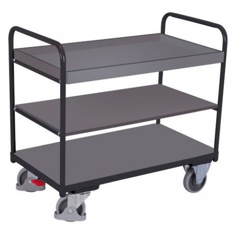 Etážové vozíky se třemi policemi vhodné pro transport materiálu a zboží. Police vyrobené z MDF desek jsou připevněné ke kovové konstrukci, která převyšuje horní polici a slouží tak zároveň jako manipulační madla. Horní police je opatřená hranou o výšce 6 cm. Pojezd zajišťují čtyři kola s valivými kuličkovými ložisky, z nichž dvě jsou pevná a dvě otočná s brzdou Easy Stop a ochrannými kryty.Policové vozíky, do 250 kg, 3 police, 1 s vyvýšenou hranou