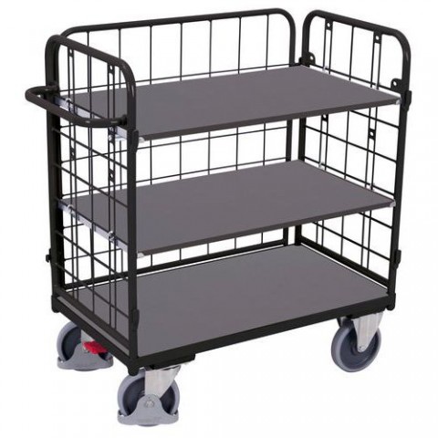 Policové vozíky se třemi policemi vhodné do skladů pro přepravu materiálu a zboží. Police vyrobené z MDF desek je možné výškově nastavit v rastru 12 cm, spodní police je pevná. Vozíky jsou opatřené mřížovými bočnicemi ze tří stran s oky velikosti 12 x 12 cm. Pojízdnost zajišťují čtyři kola s valivými kuličkovými ložisky, z nichž dvě jsou pevná a dvě otočná s brzdou Easy Stop a ochrannými kryty.Policové vozíky s madlem a mřížovými bočnicemi, do 400 - 500 kg, 3 police