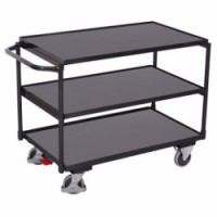 Policové vozíky se třemi policemi vhodné pro přepravu materiálu a předmětů ve skladech. Police vyrobené z MDF desek jsou zasazené do kovových rámů vozíku. Pojezd zajišťují čtyři kola s valivými kuličkovými ložisky, z nichž dvě jsou pevná a dvě otočná s brzdou Easy Stop a ochrannými kryty.Policové vozíky s madlem, do 250 kg, 3 police