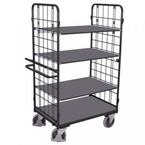 Policový vozík s mřížovými čely (oka 120 x 120 mm) a 4 policemi. Ruční brzda, která při uvolnění okamžitě zastaví celý vozík (dead man's brake). Vyjímatelné police vyrobené z MDF desek, nastavitelné v krocích po 120 mm. 2 otočná a 2 pevná kola. Šedá kola z termoplastické pryže nezanechávající stopy na plastovém ráfku s přesnými kuličkovými ložisky.Policové vozíky s mřížovými bočnicemi a ruční brzdou, 4 police