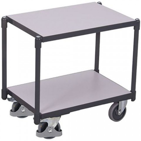 Policový ESD vozík se dvěma policemi v jedné rovině s kovovým rámem. Ložné plochy z 12mm dřevotřískové elektricky vodivé desky. Nosnost horní police 80 kg. Čtyři otočná kola, z nichž dvě jsou opatřená brzdou. Šedá kola z termoplastické pryže nezanechávající stopy na plastovém ráfku s přesnými kuličkovými ložisky, ochrana nohou.Policový vozík Euro systém dolly ESD, 2 police, 67,5 x 41,5 x 63,5 cm, šedý