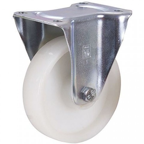 Bílé pojezdové kolo z polyamidu s přesnými kuličkovými ložisky. Teplotní odolnost od -20 do +80 °C. Tvrdost 75° Shore D.Polyamidová pojezdová kola s přírubou, průměr 125 - 200 mm, kuličkové ložisko, pevná