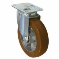 Otočná pojezdová kola s hliníkovým diskem a polyuretanovou obručí. Kola se vyznačují vysokou odolností a otěruvzdorností. typ kol: otočné materiál kol: polyuretan průměr kola: 160 - 200 mm šířka kola: 50 mm nosnost: 500 kg způsob uchycení: vidlice s přírubou výška kola s vidlicí: 193 - 238 mm vyložení kola: 53 mm ložiska: valivá (kuličková) povrchová úprava pozinkováním, odolnost proti teplotě od -20 do +80 °C, odolná proti koroziPolyuretanová transportní kola s přírubou, průměr 160 - 200 mm, otočná, valivá ložiska