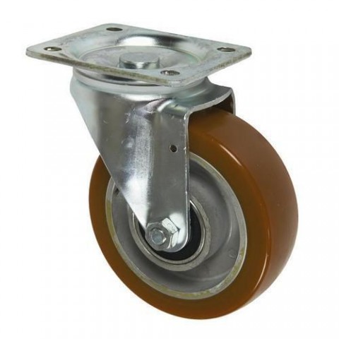 Pojezdové otočné kolo s vysokou otěruvzdorností a polyuretanovou obručí. typ kola: otočné materiál kola: polyuretan průměr kola: 125 mm šířka kola: 38 mm nosnost: 250 kg způsob uchycení: vidlice s přírubou výška kola s vidlicí: 155 mm vyložení kola: 42 mm ložiska: valivá (kuličková) povrchová úprava pozinkováním, odolnost proti teplotě od -20 do +80 °C, odolná proti koroziPolyuretanové transportní kolo s přírubou, průměr 125 mm, otočné, valivé ložisko