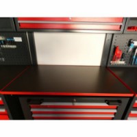 Šedá DTD deska pracovního stolu s červeným lemem. Pomocí desky a dílenského vozíku Light lze vytvořit optimální pracovní místo ve vaší dílně.Pracovní deska k dílenskému vozíku na nářadí Light, šedá, 110 x 61 x 2,5 cm