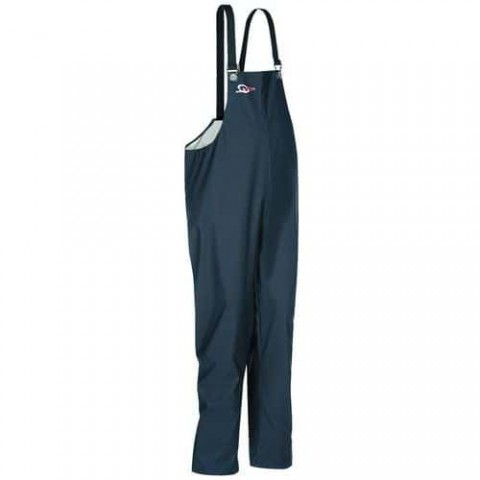 Nastavitelné elastické šle s PVC knoflíky a přezkami. Nohavice lze zúžit pomocí cvočků. Vysokofrekvenčně svařované švy.Pracovní laclové kalhoty do deště Bandung
