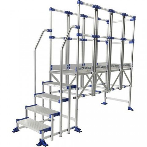 Modulární hliníkové plošiny se 3 zábradlím - 1 přední + 2 boční. Součástí jsou také dvě madla. Přístupové a výškové zabezpečení s dobře zarámovanou konstrukcí plošiny. Stabilní díky široké platformě a hlubokým protiskluzovým schůdkům. Šířka plošiny 596 mm. Plošinu lze v případě potřeby připevnit k zemi pomocí velkých dvojitých upevňovacích patek. Velmi odolná konstrukce, vhodná pro intenzivní používání, nutné rovné podlahy. Pohodlné, škálovatelné, všestranné, přizpůsobitelné všem typům potřeb.Přístupové plošiny Meca Modul Tubesca-Comabi, 3 zábradlí + 2 madla