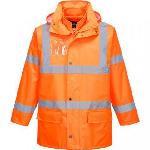 Nepromokavý reflexní kabát 5v1 pro vysokou viditelnost. Vnější a vnitřní odnímatelná bunda, lze nosit také jako vestu. Celkem 7 kapes pro ukládání věcí, dvoucestný zip, kapuce v límci, nastavitelné manžety. Tkanina odráží 98 % UV záření (50+ UPF), vodní sloupec 15 000 mm. Vnější tkanina 100% polyester, PU zátěr 190 g, podšívka 100% polyesterová síťovina 60g, vnitřní bunda 100% polyester Fleece 280 g. Splňuje normy EN ISO 20471 Třída 3; RIS-3279-TOM ISSUE 1; EN 343:2019 Třída 3:1 X WP 15,000 mm; EN 342 0.352 (M2.K/W), 2, X.Reflexní nepromokavá bunda Essential Hi-Vis 5v1, oranžová