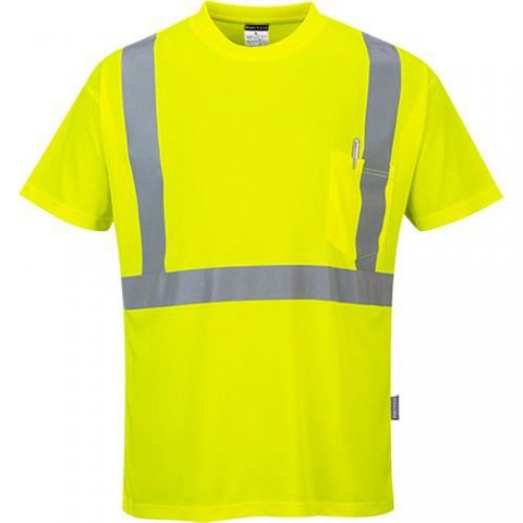 Tričko s reflexní páskou a výraznou žlutou barvou zvyšuje viditelnost pracovníků. Náprsní kapsa pro bezpečné uložení věcí. Kvalitní materiál odvádí z těla vlhkost a zaručuje svěžest, pocit sucha a pohodlí. Tkanina odráží 98% UV záření (50+ UPF). Materiál 100% polyester, Bird Eye Knit 150 g/m2. Splňuje normy EN ISO 20471 Třída 2 a ANSI/ISEA 107 TYPE R Třída 2.Reflexní tričko s krátkým rukávem Pocket Hi-Vis, žluté