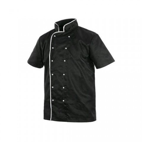 Kuchařský rondon v moderním designu, s krátkým rukávem a stojákem, dvouřadé zapínání na druky. Vhodné pro výšivku a potisk. Doporučené použití: kuchaři, učni. Velikost: 42-64Rondon CHEF s krátkým rukávem, pánský, černo-bílý