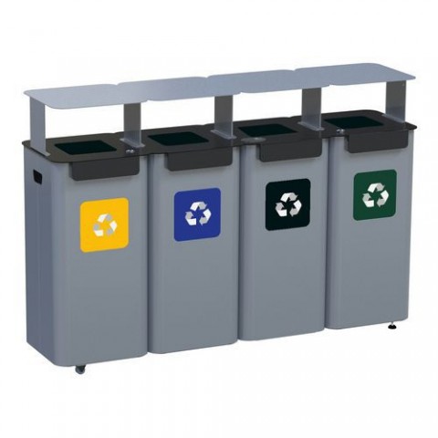 Sada čtyř kovových venkovních odpadkových košů Modular Hood na tříděný odpad. Vyrobeny z galvanizované oceli s povrchovou úpravou práškovým lakem (RAL 9006). Zvýšená odolnost a antikorozní vlastnosti. Ochranná stříška proti dešti. Součástí každého koše je piktogram a víko s možností uzamčení. Výškově nastavitelné nohy s protiskluzovými patkami. Kolečka a boční madlo pro snadnou manipulaci. Vybaveno vnitřním uchycením pro odpadkové pytle.Sada 4 ks kovových venkovních odpadkových košů Modular Hood na tříděný odpad, objem 4 x 70 l