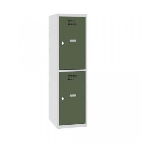 Snížené svařované šatní skříně se dvěma samostatně uzavíratelnými boxy. Jsou vhodné do škol a díky své výšce jsou ideální i pro žáky prvního stupně. Vyrobeny z ocelového plechu s povrchovou úpravou práškovým lakem. Skříně jsou vybaveny dvěma policemi na knihy a háčkem na oblečení. Větrací mřížky ve dveřích, úhel otevření dveří s bezpečnostní pojistkou max. na 90°, samolepicí štítek na jméno, možnost dokoupení horního šikmého nástavce. Uzamykání otočným uzávěrem na visací zámek (visací zámek není součástí dodávky).Snížené školní šatní skříně, 2 oddíly, 400 mm, otočný uzávěr