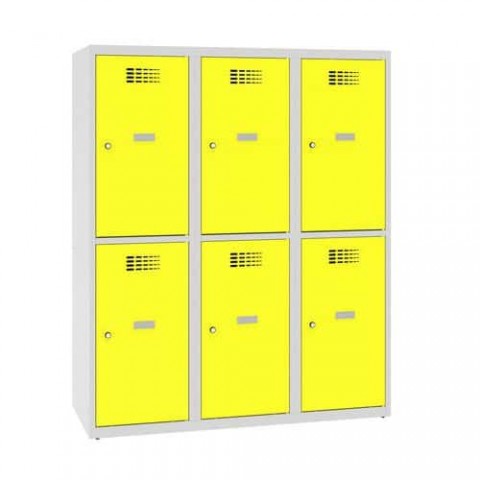 Snížené svařované šatní skříně se šesti samostatně uzamykatelnými oddíly. Jsou vhodné do škol a díky své výšce jsou ideální i pro žáky prvního stupně. Vyrobeny z ocelového plechu s povrchovou úpravou práškovým lakem. Skříně jsou vybaveny dvěma policemi na knihy a háčkem na oblečení. Větrací mřížky ve dveřích, úhel otevření dveří s bezpečnostní pojistkou max. na 90°, samolepicí štítek na jméno, možnost dokoupení horního šikmého nástavce. Uzamykání cylindrickým zámkem se dvěma klíči.Snížené školní šatní skříně, 6 oddílů, 400 mm, cylindrický zámek