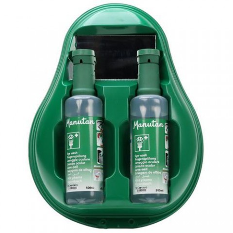 Stanice na dvě sterilní lahve roztoku na výplach očí o objemu 500 ml. Montáž na stěnu kdekoli na vašem pracovišti. Obsahuje velké zrcátko pro snadnější ošetření oči. Průhledný kryt pro optimální viditelnost.Stanice na dvě láhve očního roztoku, 500 ml Manutan Expert