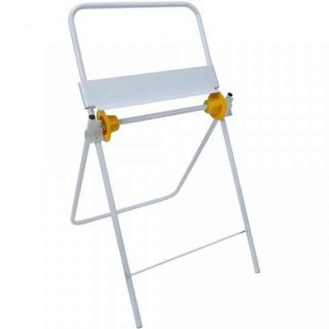 Skládací stojan na průmyslové utěrky. Opatřen nastavitelným ozubeným nožem (44,5 x 9,7 cm) pro snadné odtrhávání. Nosná tyč je opatřená žlutými plastovými kužely pro stabilitu role. Držák je vhodný pro role s maximálním průměrem 35 cm. Ošetřeno práškovou bílou barvou.Stojan na průmyslové utěrky Manutan Expert