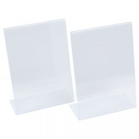 Bezbarvé stolní stojánky L na prospekty s orientací na výšku. Jednostranná prezentace. Vkládání prospektů z boční strany.Stojánky na letáky Manutan Expert, typ L na výšku