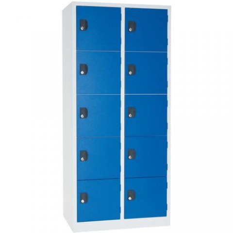Svařované šatní skříně s boxy vhodné pro odkládání osobních věcí zaměstnanců na pracovištích, v převlékárnách nebo sportovních klubech. Konstrukce z ocelového plechu tloušťky 0,7 mm s výztuhami zajišťuje dobrou stabilitu. Účinné odvádění vlhkosti z oděvů větracími otvory zadní straně boxů. Dvířka boxů jsou zavěšená na vnějších pantech a jsou opatřeny plastovými nárazníky pro snížení hluku při zavírání. Možnost umístění štítku se jménem v plastovém úchytu na dveřích.Svařované šatní skříně Manutan Expert Axl, 10 boxů, cylindrický zámek