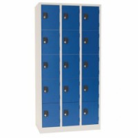 Svařované šatní skříně s boxy vhodné pro odkládání osobních věcí zaměstnanců na pracovištích, v převlékárnách nebo sportovních klubech. Konstrukce z ocelového plechu tloušťky 0,7 mm s výztuhami zajišťuje dobrou stabilitu. Účinné odvádění vlhkosti z oděvů větracími otvory zadní straně boxů. Dvířka boxů jsou zavěšená na vnějších pantech a jsou opatřeny plastovými nárazníky pro snížení hluku při zavírání. Možnost umístění štítku se jménem v plastovém úchytu na dveřích.Svařované šatní skříně Manutan Expert Pierre, 15 boxů, cylindrický zámek