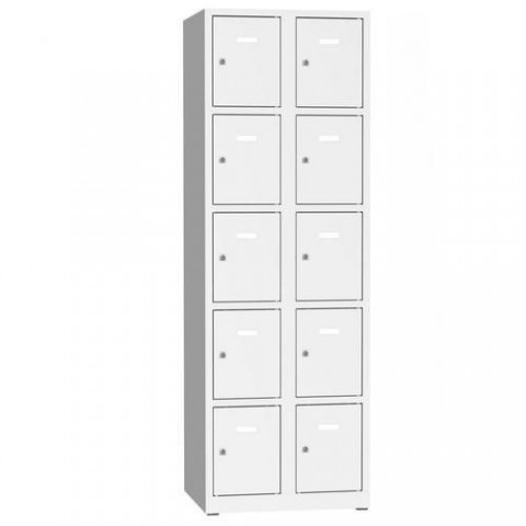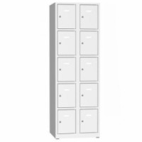 Svařované boxové šatní skříňky v několika barevných variantách, vhodné pro odkládání věcí na pracovištích, převlékárnách nebo sportovních klubech. Konstrukce z ocelového plechu tloušťky 0,6 mm s výztuhami zajišťuje dobrou stabilitu. Účinné odvádění vlhkosti z oděvů větracími otvory na zadní straně. Dvířka boxů jsou zavěšená na vnitřních pantech. Tlumení hluku při zavírání dvířek zajišťují plastové dorazy. Uzamykání každého boxu cylindrickým zámkem. Snadno udržovatelný hladký prostor uvnitř boxu. Možnost umístění štítku se jménem v horní části dveří. Skříň na vyvýšeném rámu, který je osazen čtyřmi plastovými patkami. Světlost dvířek 31 x 20,9 cm.Svařované šatní skříně Philip, 10 boxů, cylindrický zámek