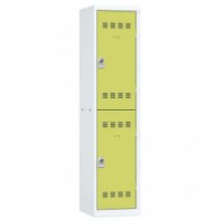 Více-oddílová šatní skříň svařovaná z ocelového plechu tloušťky 0,7 mm. Každý oddíl je vybaven tyčí na ramínka a dvěma háčky (uzamykání otočným uzávěrem na visací zámek - není součástí dodávky). Perforovaná dvířka zajišťují účinné odvětrávání vnitřního prostoru. Možnost umístění štítku se jménem.Svařované šatní skříně Vinco, 1 sloupec, 2 boxy, 400 mm, otočný uzávěr
