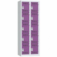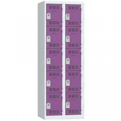 Více-oddílová šatní skříň svařovaná z ocelového plechu tloušťky 0,7 mm. Jednotlivé oddíly jsou samostatně uzamykatelné cylindrickým zámkem se dvěma klíči. Perforovaná dvířka zajišťují účinné odvětrávání vnitřního prostoru. Možnost umístění štítku se jménem.Svařované šatní skříně Vinco, 2 sloupce, 10 boxů, 300 mm, cylindrický zámek