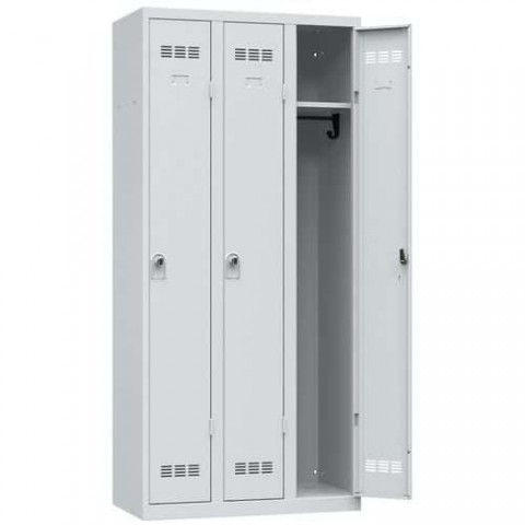 Šatní skříň svařovaná z ocelového plechu tloušťky 0,7 mm. Každý oddíl je vybaven tyčí na ramínka a dvěma háčky. Uzamykání otočným uzávěrem na visací zámek (není součástí dodávky). Perforovaná dvířka zajišťují účinné odvětrávání vnitřního prostoru. Možnost umístění štítku se jménem.Svařované šatní skříně Vinco, 3 oddíly, 300 mm, otočný uzávěr
