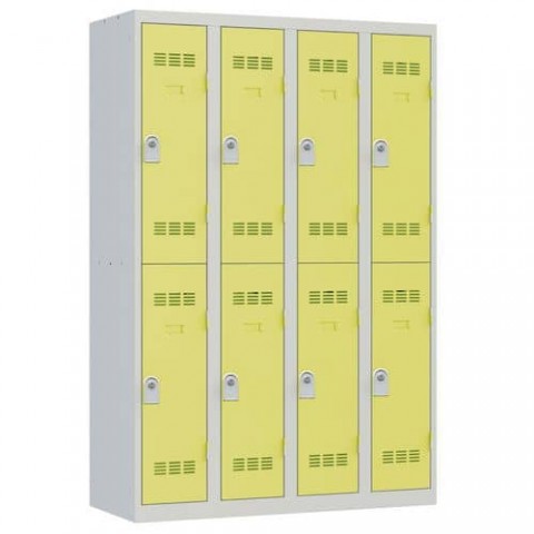 Více-oddílová šatní skříň svařovaná z ocelového plechu tloušťky 0,7 mm. Každý oddíl je vybaven tyčí na ramínka a dvěma háčky (uzamykání cylindrickým zámkem se dvěma klíči). Perforovaná dvířka zajišťují účinné odvětrávání vnitřního prostoru. Možnost umístění štítku se jménem.Svařované šatní skříně Vinco, 4 sloupce, 8 boxů, 300 mm, cylindrický zámek