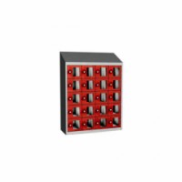 Svařované boxové skříně s malými schránkami s průzorem z plexiskla na osobní věci nebo ke skladování svačin a obědů. Jednotlivé schránky jsou samostatně uzamykatelné cylindrickým zámkem na klíč. Možnost umístění štítku se jménem nebo osobním číslem. Opatřeny horním šikmým nástavcem, otevírání dvířek až do úhlu 110°. Upevnění na zeď, vytvoření větších bloků spojením více skříní dohromady. Rozměry průzoru v x š - 117 x 95 mm.Svařované skříně na osobní věci Olaf s průhlednými dvířky, 20 boxů, cylindrický zámek