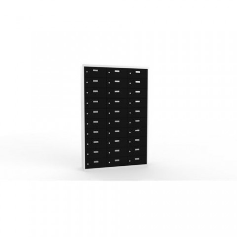 Skříně ze svařovaného plechu s malými schránkami na uložení osobních věcí. Vhodné do kantýny, posiloven, fitness center, bazenů nebo recepce hotelů. Jednotlivé schránky jsou samostatně uzamykatelné cylindrickým zámkem na klíč. Možnost vložení štítku se jménem nebo číslem na dvířka každé schránky.Svařované skříně na osobní věci Ron II, 30 boxů, cylindrický zámek