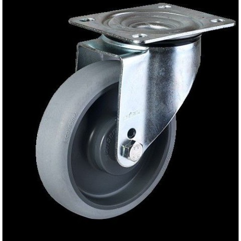 Pojezdová kola s běhounem z termoplastického elastomeru Ecoforma®. Běhoun má nízký válivý odpor a je odolný vůči chemikáliím a páře. Nezanechává stopy a dobře odolává nečistotám jako jsou kovové hobliny. Tvrdost běhounu je 70° Shore A.TPE transportní kola s přírubou, průměr 160 - 200 mm, otočná, kuličková ložiska