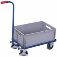Plošinový vozík s plastovou přepravkou o rozměru 600 x 400 mm. Jednoduché tlačné madlo. Šedá kola z termoplastické pryže nezanechávající stopy na plastovém ráfku s přesnými kuličkovými ložisky, ochrana nohou. Dvě pevná a dvě otočná kola s brzdou.Vozíky s plastovou přepravkou, 89 x 42 x 87,5 cm