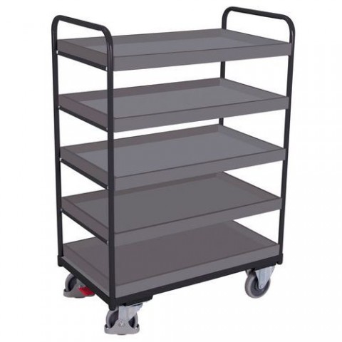 Vysoký policový vozík s pěti policemi vhodný pro přepravu materiálu a zboží. Police z MDF desky s vyvýšenými hranami 4,5 cm zamezují vypadávání předmětů z vozíku. Pohyb zajišťují čtyři kola s valivými kuličkovými ložisky, z nichž dvě jsou pevná a dvě otočná s brzdou Easy Stop a ochrannými kryty. Vozík je opatřen TUV certifikátem.Vysoké policové vozíky, do 250 kg, 5 polic s vyvýšenými hranami