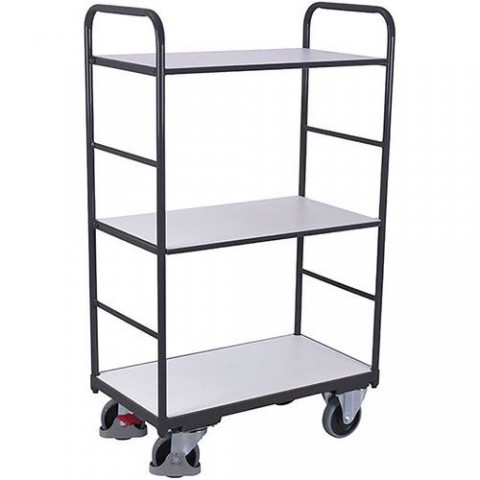 Vysoký antistatický policový vozík se třemi policemi. Ložná plocha z elektricky vodivé laminátové dřevotřísky. Police jsou vsazené do ocelového rámu a lze je vyjímat. 2 pevná a 2 otočná kola s brzdou EasySTOP. Šedá kola z termoplastické pryže nezanechávající stopy na plastovém ráfku s přesnými kuličkovými ložisky.Vysoké policové vozíky ESD, 3 police, do 250 kg