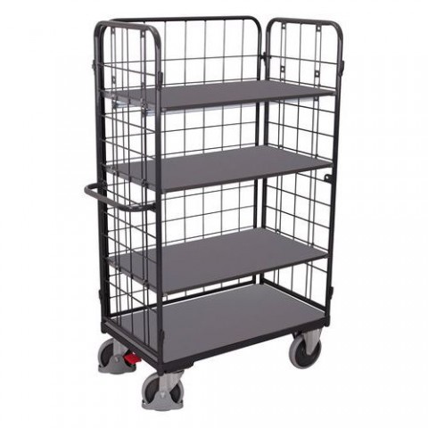 Vysoké policové vozíky se čtyřmi policemi vhodné do skladů pro přepravu materiálu a zboží. Police jsou vyrobené z MDF desky, tři z nich jsou přestavitelné v rastru 12 cm. Vozíky jsou opatřené mřížovými bočnicemi s oky velikosti 12 x 12 cm. Pohyb zajišťují čtyři kola s valivými kuličkovými ložisky, z nichž dvě jsou pevná a dvě otočná s brzdou Easy Stop a ochrannými kryty.Vysoké policové vozíky s madlem a mřížovými bočnicemi, do 400 - 500 kg, 4 police