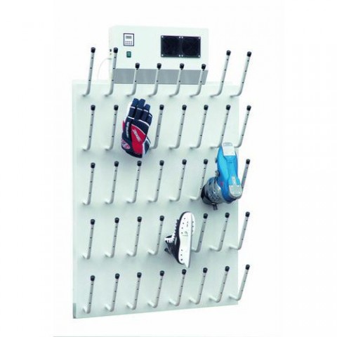 Vysoušeč bot, rukavic a lyžáků vhodný pro horské chaty, hotely nebo sportovní kluby. Nucená cirkulace proudu teplého vzduchu cca 45 °C zajišťuje rychlé, hygienické a bezpečné vysušení obuvi nebo rukavic. Standardně vybaven digitálním časovačem s 8 programy pro zapnutí a vypnutí. Orientační délka sušení vlhké obuvi je 30 minut a mokré obuvi 120 minut. Montáž na stěnu. Stupeň krytí IP 42.Vysoušeč obuvi a rukavic, 40 háků