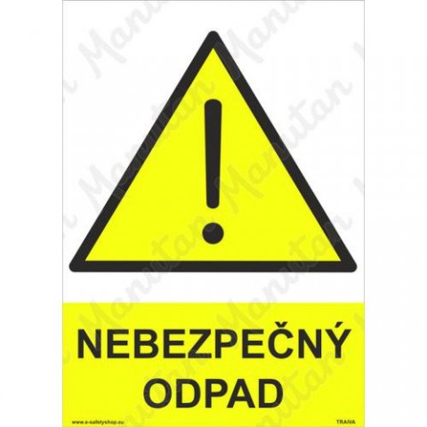 Bezpečnostní značka, tabulka nebo samolepka "Nebezpečný odpad" je tištěna na vysoce kvalitním materiálu, barvami s vysokou odolností proti otěru a UV záření. Provedení plně odpovídá požadavkům právních a technických předpisů, zejména Nařízení vlády č. 375/2017 Sb., ČSN ISO 3864-1, ČSN ISO 3864-2, ČSN ISO 3864-3, ČSN ISO 3864-4.Výstražné tabulky - Nebezpečný odpad