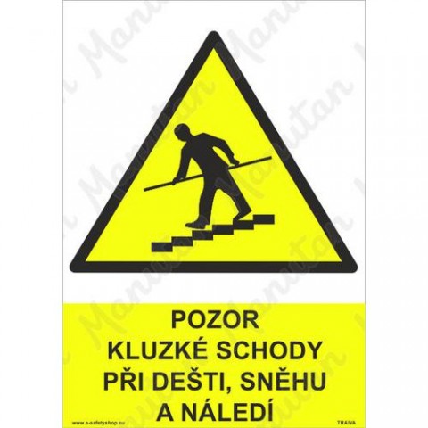 Bezpečnostní značka, tabulka nebo samolepka "Pozor kluzké schody při dešti, sněhu a náledí" plně odpovídá požadavkům právních a technických předpisů, zejména Nařízení vlády č. 375/2017 Sb., ČSN ISO 3864-1, ČSN ISO 3864-2, ČSN ISO 3864-3, ČSN ISO 3864-4.Výstražné tabulky - Pozor kluzké schody při dešti, sněhu a náledí