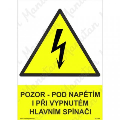 Bezpečnostní značka, tabulka nebo samolepka "Pozor pod napětím i při vypnutém hlavním spínači" plně odpovídá požadavkům právních a technických předpisů, zejména Nařízení vlády č. 375/2017 Sb., ČSN ISO 3864-1, ČSN ISO 3864-2, ČSN ISO 3864-3, ČSN ISO 3864-4.Výstražné tabulky - Pozor pod napětím i při vypnutém hlavním spínači