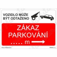 Bezpečnostní značení tabulkou, značkou nebo samolepkou "Zákaz parkování" tiskneme na vysoce kvalitním materiálu, barvami s vysokou odolností proti otěru a UV záření. Tím zajišťujeme splnění požadavků Nařízení vlády č. 375/2017 Sb., ČSN ISO 3864-1, ČSN ISO 3864-2, ČSN ISO 3864-3, ČSN ISO 3864-4. Používá se k označení míst a objektů (např. vjezd do garáže nebo do areálu), kde je zákaz parkování v určité vzdálenosti. Při porušení zákazu může být vozidlo odtaženo.Zákazové tabulky - Zákaz parkování
