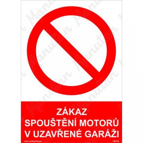 Bezpečnostní značení tabulkou, značkou nebo samolepkou "Zákaz spouštění motorů v uzavřené garáži" je tištěno na vysoce kvalitním materiálu, barvami s vysokou odolností proti otěru a UV záření. Tak, aby provedení značení bylo plně v souladu s Nařízením vlády č. 375/2017 Sb., ČSN ISO 3864 a ČSN ISO 3864-1. Tabulka upozorňuje na zákaz spouštění motorů v uzavřené garáži.Zákazové tabulky - Zákaz spouštění motorů v uzavřené garáži