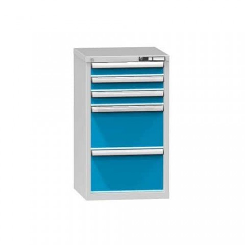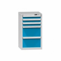 Zásuvková skříň je opatřená mechanismem centrálního zamykání a blokace zásuvek. Zásuvky jsou základním skladovacím prvkem, a proto splňují vysoké požadavky na pevnost a stabilitu. Korpusy zásuvkových skříní tvoří svařenec jednotlivých konstrukčních dílů z kvalitních ocelových plechů. Vnitřní konstrukce korpusů je opatřena perforací po 25 mm. Tuto perforaci využíváme k uchycení vodicích lišt zásuvek, jejich výškovému uspořádání a nakonfigurování požadované zásuvkové sestavy. Přestavování vodicích lišt nebo háčků polic probíhá jednoduše a velice rychle bez použití nástrojů.Zásuvkové skříně ZA3, 578 x 600 x 990 mm
