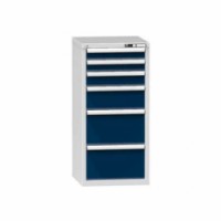 Zásuvková skříň je opatřená mechanismem centrálního zamykání a blokace zásuvek. Zásuvky jsou základním skladovacím prvkem, a proto splňují vysoké požadavky na pevnost a stabilitu. Korpusy zásuvkových skříní tvoří svařenec jednotlivých konstrukčních dílů z kvalitních ocelových plechů. Vnitřní konstrukce korpusů je opatřena perforací po 25 mm. Tuto perforaci využíváme k uchycení vodicích lišt zásuvek, jejich výškovému uspořádání a nakonfigurování požadované zásuvkové sestavy. Přestavování vodicích lišt nebo háčků polic probíhá jednoduše a velice rychle bez použití nástrojů.Zásuvkové skříně ZA6, 578 x 600 x 1215 mm
