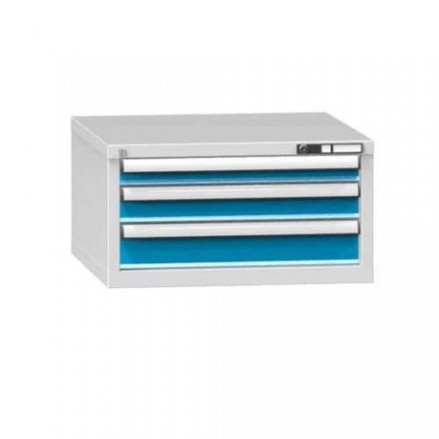 Zásuvková skříň je opatřená mechanismem centrálního zamykání a blokace zásuvek. Zásuvky jsou základním skladovacím prvkem, a proto splňují vysoké požadavky na pevnost a stabilitu. Korpusy zásuvkových skříní tvoří svařenec jednotlivých konstrukčních dílů z kvalitních ocelových plechů. Vnitřní konstrukce korpusů je opatřena perforací po 25 mm. Tuto perforaci využíváme k uchycení vodicích lišt zásuvek, jejich výškovému uspořádání a nakonfigurování požadované zásuvkové sestavy. Přestavování vodicích lišt nebo háčků polic probíhá jednoduše a velice rychle bez použití nástrojů.Zásuvkové skříně ZB4, 731 x 753 x 390 mm