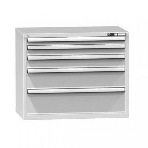 Zásuvková skříň je opatřená mechanismem centrálního zamykání a blokace zásuvek. Zásuvky jsou základním skladovacím prvkem, a proto splňují vysoké požadavky na pevnost a stabilitu. Korpusy zásuvkových skříní tvoří svařenec jednotlivých konstrukčních dílů z kvalitních ocelových plechů. Vnitřní konstrukce korpusů je opatřena perforací po 25 mm. Tuto perforaci využíváme k uchycení vodicích lišt zásuvek, jejich výškovému uspořádání a nakonfigurování požadované zásuvkové sestavy. Přestavování vodicích lišt nebo háčků polic probíhá jednoduše a velice rychle bez použití nástrojů.Zásuvkové skříně ZC5, 1037 x 600 x 840 mm