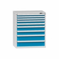 Zásuvková skříň je opatřená mechanismem centrálního zamykání a blokace zásuvek. Zásuvky jsou základním skladovacím prvkem, a proto splňují vysoké požadavky na pevnost a stabilitu. Korpusy zásuvkových skříní tvoří svařenec jednotlivých konstrukčních dílů z kvalitních ocelových plechů. Vnitřní konstrukce korpusů je opatřena perforací po 25 mm. Tuto perforaci využíváme k uchycení vodicích lišt zásuvek, jejich výškovému uspořádání a nakonfigurování požadované zásuvkové sestavy. Přestavování vodicích lišt nebo háčků polic probíhá jednoduše a velice rychle bez použití nástrojů.Zásuvkové skříně ZG4, 1037 x 753 x 1215 mm