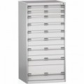 Zásuvková skříň je opatřená mechanismem centrálního zamykání a blokace zásuvek. Zásuvky jsou základním skladovacím prvkem, a proto splňují vysoké požadavky na pevnost a stabilitu. Korpusy zásuvkových skříní tvoří svařenec jednotlivých konstrukčních dílů z kvalitních ocelových plechů. Vnitřní konstrukce korpusů je opatřena perforací po 25 mm. Tuto perforaci využíváme k uchycení vodicích lišt zásuvek, jejich výškovému uspořádání a nakonfigurování požadované zásuvkové sestavy. Přestavování vodicích lišt nebo háčků polic probíhá jednoduše a velice rychle bez použití nástrojů.Zásuvkové skříně ZH6, 442 x 753 x 840 mm