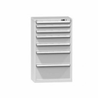 Zásuvková skříň je opatřená mechanismem centrálního zamykání a blokace zásuvek. Zásuvky jsou základním skladovacím prvkem, a proto splňují vysoké požadavky na pevnost a stabilitu. Korpusy zásuvkových skříní tvoří svařenec jednotlivých konstrukčních dílů z kvalitních ocelových plechů. Vnitřní konstrukce korpusů je opatřena perforací po 25 mm. Tuto perforaci využíváme k uchycení vodicích lišt zásuvek, jejich výškovému uspořádání a nakonfigurování požadované zásuvkové sestavy. Přestavování vodicích lišt nebo háčků polic probíhá jednoduše a velice rychle bez použití nástrojů.Zásuvkové skříně ZP6, 731 x 464 x 1215 mm