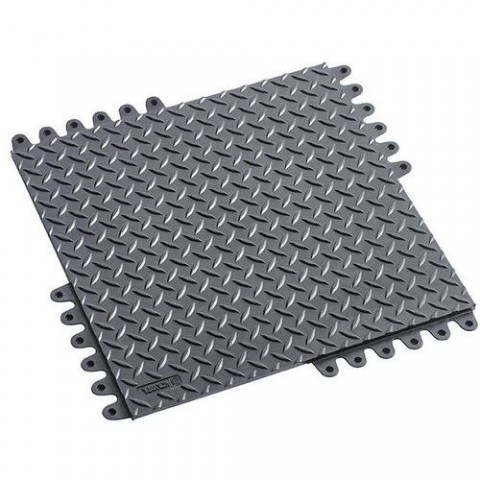Extrémně pohodlný systém protiúnavových rohoží pro vysoké zatížení s diamantovým povrchem, snadno sestavitelný pro pokrytí velkých ploch nebo vytvoření jednotlivých stanovišť. Tyto modulární pryžové dlaždice o rozměrech 45 x 45 cm byly navrženy s dvojitým univerzálním spojovacím systémem na všech 4 stranách, který zajišťuje robustní a dokonalé spojení, jež se snadno instaluje. Tyto rohože o tloušťce 19 mm izolují pracovníka od tvrdé podlahy a bublinkové kopule pod podrážkou umožňují, aby rohož zůstala měkká a pružná při každém pohybu. Okraje zabraňují zakopnutí a pádu a umožňují snadný přístup pro vozíky. Řešení pro vnitřní a vnější rohy.Zátěžové podlahy De-Flex, 450 x 450 x19 mm, gumové, černá