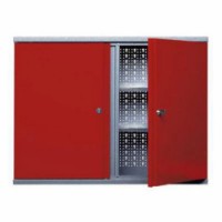 Závěsná pracovní skříňka je rozdělená do dvou částí, kde každá disponuje perforovanou zadní stěnou pro umístění držáků na nářadí a dvěma výškově přestavitelnými policemi. Dveře jsou uzamykatelné cylindrickým zámkem.Závěsná skříňka na nářadí, 60 x 80 x 19 cm
